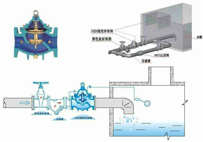 当水塔(池)的水面上升至设定高度时,浮球浮起关闭浮球阀,控制室内水压升高,推动主阀关闭,供水停止。当水面下降时,浮球阀重新开启,控制室水压下降,主阀再次开启继续供水,保持液面的设定高度。